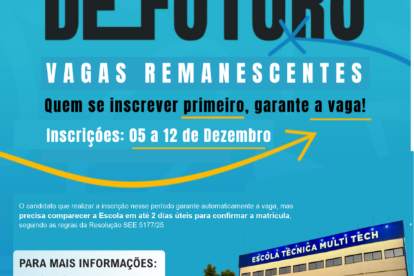 Estudantes que buscam uma formação profissional e ainda não foram selecionados para uma vaga em um curso técnico gratuito do Trilhas de Futuro agora têm uma nova chance. Estão abertas as inscrições para as VAGAS REMANESCENTES do programa do Governo de Minas, por meio da Secretaria de Estado de Educação (SEE/MG). Aqueles que não foram selecionados na chamada regular…